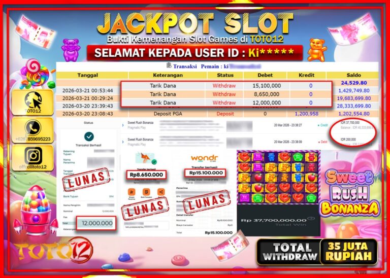 Selamat kepada Member Kami Ki**** Telah Jackpot dan berhasil mendapatkan kemenangan besar pada permainan JACKPOT SLOT GAME (SWEET RUSH BONANZA) Dengan Kemenangan Sebesar Rp.35.750.000–. Setelah mengisi Fomulir Withdraw dengan Kurang waktu 1-2 Menit Dana sudah kami Trasnfer kepada Pemilik Userid dan dana sudah dapat di cairkan oleh pemenang. Bukti Pembayaran yang TOTO12 berikan merupakan Bukti Pembayaran…