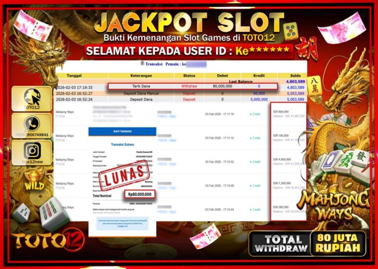Selamat kepada Member Kami Ke****** Telah Jackpot dan berhasil mendapatkan kemenangan besar pada permainan JACKPOT SLOT GAME (MAHJONG WAYS) Dengan Kemenangan Sebesar Rp.80.000.000 –. Setelah mengisi Fomulir Withdraw dengan Kurang waktu 1-2 Menit Dana sudah kami Trasnfer kepada Pemilik Userid dan dana sudah dapat di cairkan oleh pemenang. Bukti Pembayaran yang TOTO12 berikan merupakan Bukti Pembayaran…