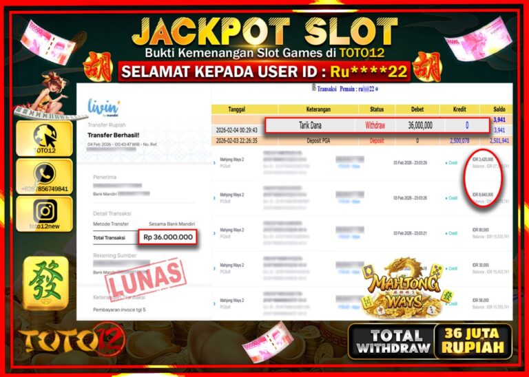 Selamat kepada Member Kami Ru******22 Telah Jackpot dan berhasil mendapatkan kemenangan besar pada permainan JACKPOT SLOT GAME (MAHJONG WAYS) Dengan Kemenangan Sebesar Rp.36.000.000 –. Setelah mengisi Fomulir Withdraw dengan Kurang waktu 1-2 Menit Dana sudah kami Trasnfer kepada Pemilik Userid dan dana sudah dapat di cairkan oleh pemenang. Bukti Pembayaran yang TOTO12 berikan merupakan Bukti Pembayaran…