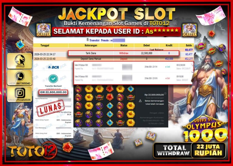 Selamat kepada Member Kami As**** Telah Jackpot dan berhasil mendapatkan kemenangan besar pada permainan JACKPOT SLOT GAME (GATES OF OLYMPUS 1000) Dengan Kemenangan Sebesar Rp.22.500.000–. Setelah mengisi Fomulir Withdraw dengan Kurang waktu 1-2 Menit Dana sudah kami Trasnfer kepada Pemilik Userid dan dana sudah dapat di cairkan oleh pemenang. Bukti Pembayaran yang TOTO12 berikan merupakan Bukti…