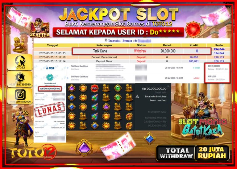Selamat kepada Member Kami Do**** Telah Jackpot dan berhasil mendapatkan kemenangan besar pada permainan JACKPOT SLOT GAME (SLOT MANIA GATOTKACA) Dengan Kemenangan Sebesar Rp.20.000.000–. Setelah mengisi Fomulir Withdraw dengan Kurang waktu 1-2 Menit Dana sudah kami Trasnfer kepada Pemilik Userid dan dana sudah dapat di cairkan oleh pemenang. Bukti Pembayaran yang TOTO12 berikan merupakan Bukti Pembayaran…