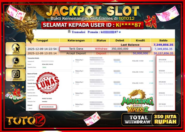 Selamat kepada Member Kami Ki****** Telah Jackpot dan berhasil mendapatkan kemenangan besar pada permainan JACKPOT SLOT GAME (MAHJONG WAYS 2) Dengan Kemenangan Sebesar Rp.350.000.000 –. Setelah mengisi Fomulir Withdraw dengan Kurang waktu 1-2 Menit Dana sudah kami Trasnfer kepada Pemilik Userid dan dana sudah dapat di cairkan oleh pemenang. Bukti Pembayaran yang TOTO12 berikan merupakan Bukti…