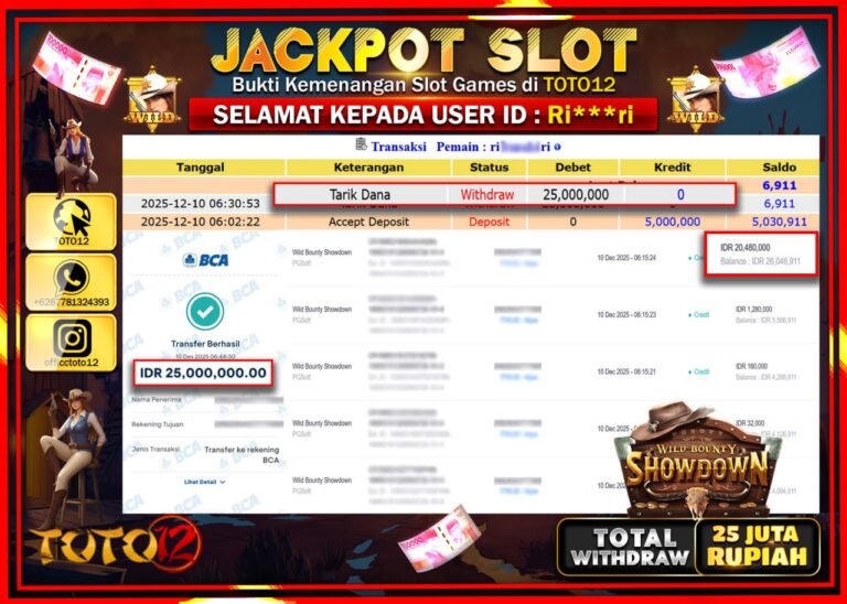 Selamat kepada Member Kami Ri****** Telah Jackpot dan berhasil mendapatkan kemenangan besar pada permainan JACKPOT SLOT GAME (WILD BOUNTY SHOWDOWN) Dengan Kemenangan Sebesar Rp.25.000.000 –. Setelah mengisi Fomulir Withdraw dengan Kurang waktu 1-2 Menit Dana sudah kami Trasnfer kepada Pemilik Userid dan dana sudah dapat di cairkan oleh pemenang. Bukti Pembayaran yang TOTO12 berikan merupakan Bukti…