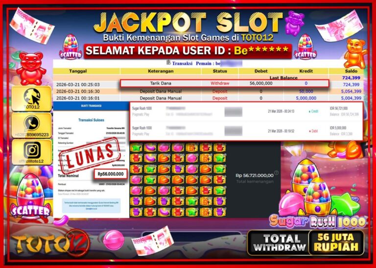 Selamat kepada Member Kami Be**** Telah Jackpot dan berhasil mendapatkan kemenangan besar pada permainan JACKPOT SLOT GAME (SUGAR RUSH 1000) Dengan Kemenangan Sebesar Rp.56.000.000–. Setelah mengisi Fomulir Withdraw dengan Kurang waktu 1-2 Menit Dana sudah kami Trasnfer kepada Pemilik Userid dan dana sudah dapat di cairkan oleh pemenang. Bukti Pembayaran yang TOTO12 berikan merupakan Bukti Pembayaran…