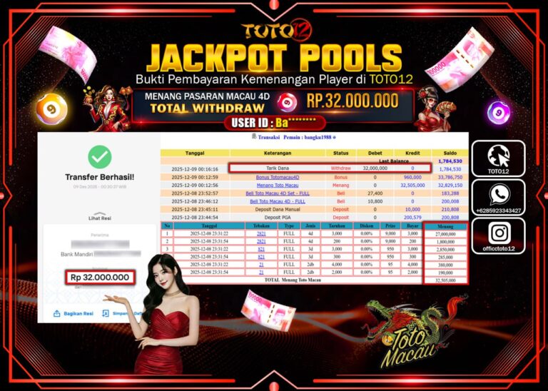 Selamat kepada Member Kami Ba****** Telah Jackpot dan berhasil mendapatkan kemenangan besar pada permainan JACKPOT POOLS PASARAN (MACAU 4D) Dengan Kemenangan Sebesar Rp.32.000.000 –. Setelah mengisi Fomulir Withdraw dengan Kurang waktu 1-2 Menit Dana sudah kami Trasnfer kepada Pemilik Userid dan dana sudah dapat di cairkan oleh pemenang. Bukti Pembayaran yang TOTO12 berikan merupakan Bukti Pembayaran…