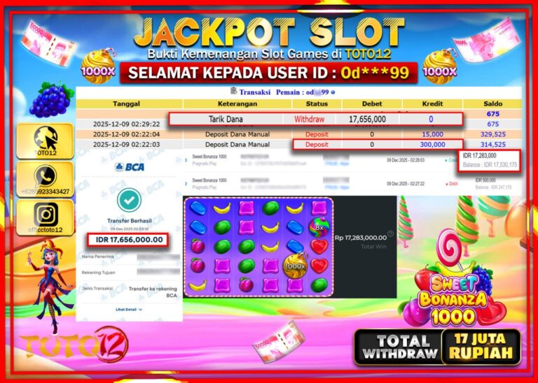 Selamat kepada Member Kami Od****** Telah Jackpot dan berhasil mendapatkan kemenangan besar pada permainan JACKPOT SLOT GAME (SWEET BONANZA 1000) Dengan Kemenangan Sebesar Rp.17.656.000 –. Setelah mengisi Fomulir Withdraw dengan Kurang waktu 1-2 Menit Dana sudah kami Trasnfer kepada Pemilik Userid dan dana sudah dapat di cairkan oleh pemenang. Bukti Pembayaran yang TOTO12 berikan merupakan Bukti…