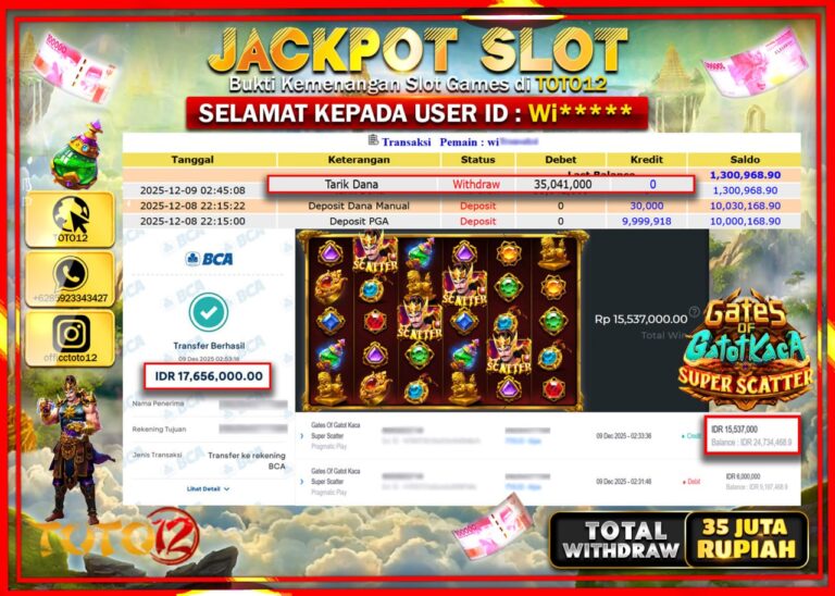Selamat kepada Member Kami Wi****** Telah Jackpot dan berhasil mendapatkan kemenangan besar pada permainan JACKPOT SLOT GAME (GATES OF GATOT KACA SUPER SCATTER) Dengan Kemenangan Sebesar Rp.35.041.000 –. Setelah mengisi Fomulir Withdraw dengan Kurang waktu 1-2 Menit Dana sudah kami Trasnfer kepada Pemilik Userid dan dana sudah dapat di cairkan oleh pemenang. Bukti Pembayaran yang TOTO12…