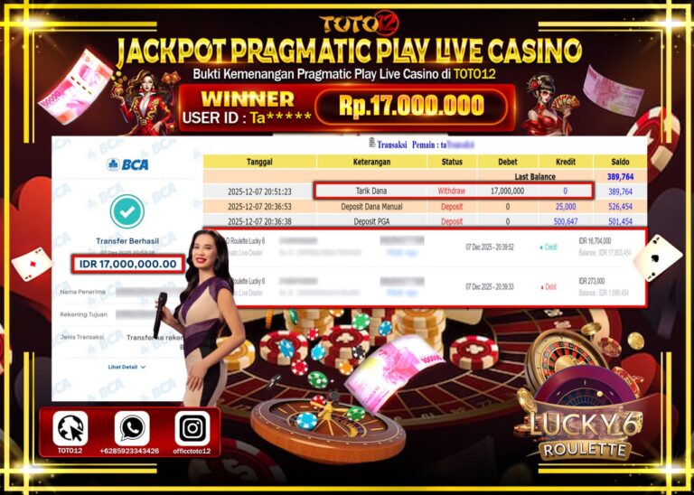 Selamat kepada Member Kami Ta****** Telah Jackpot dan berhasil mendapatkan kemenangan besar pada permainan JACKPOT PRAGMATIC PLAY LIVE CASINO (ROULETTE LUCKY 6) Dengan Kemenangan Sebesar Rp.17.000.000 –. Setelah mengisi Fomulir Withdraw dengan Kurang waktu 1-2 Menit Dana sudah kami Trasnfer kepada Pemilik Userid dan dana sudah dapat di cairkan oleh pemenang. Bukti Pembayaran yang TOTO12 berikan…