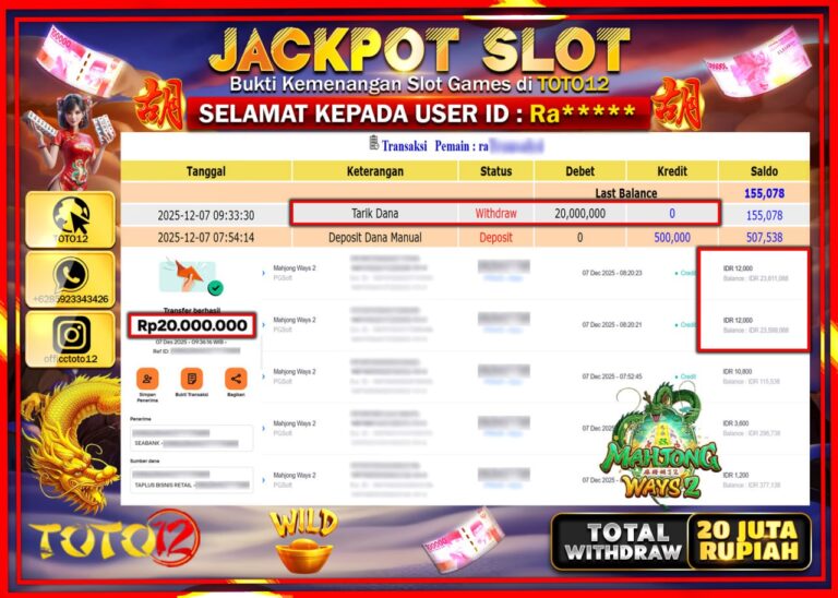 Selamat kepada Member Kami Ra****** Telah Jackpot dan berhasil mendapatkan kemenangan besar pada permainan JACKPOT SLOT GAME (MAHJONG WAYS 2) Dengan Kemenangan Sebesar Rp.20.000.000 –. Setelah mengisi Fomulir Withdraw dengan Kurang waktu 1-2 Menit Dana sudah kami Trasnfer kepada Pemilik Userid dan dana sudah dapat di cairkan oleh pemenang. Bukti Pembayaran yang TOTO12 berikan merupakan Bukti…