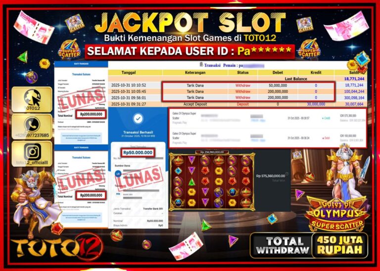 Selamat kepada Member Kami Pa****** Telah Jackpot dan berhasil mendapatkan kemenangan besar pada permainan JACKPOT SLOT GAME (GATES OF OLYMPUS SUPER SCATTER) Dengan Kemenangan Sebesar Rp.450.000.000 –. Setelah mengisi Fomulir Withdraw dengan Kurang waktu 1-2 Menit Dana sudah kami Trasnfer kepada Pemilik Userid dan dana sudah dapat di cairkan oleh pemenang. Bukti Pembayaran yang TOTO12 berikan…