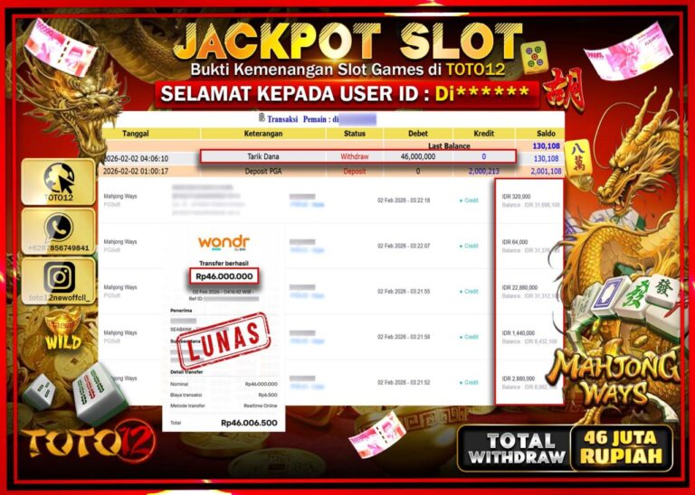 Selamat kepada Member Kami Di****** Telah Jackpot dan berhasil mendapatkan kemenangan besar pada permainan JACKPOT SLOT GAME (MAHJONG WAYS) Dengan Kemenangan Sebesar Rp.46.000.000 –. Setelah mengisi Fomulir Withdraw dengan Kurang waktu 1-2 Menit Dana sudah kami Trasnfer kepada Pemilik Userid dan dana sudah dapat di cairkan oleh pemenang. Bukti Pembayaran yang TOTO12 berikan merupakan Bukti Pembayaran…