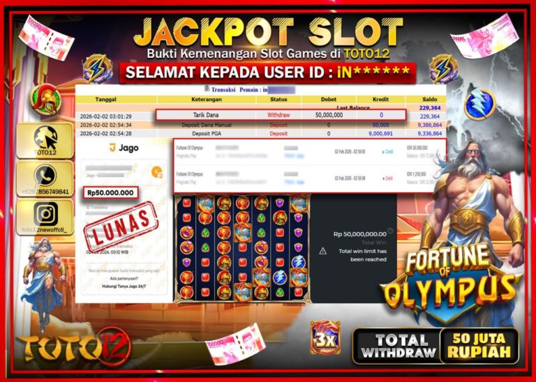 Selamat kepada Member Kami In****** Telah Jackpot dan berhasil mendapatkan kemenangan besar pada permainan JACKPOT SLOT GAME (FORTUNE OF OLYMPUS) Dengan Kemenangan Sebesar Rp.50.000.000 –. Setelah mengisi Fomulir Withdraw dengan Kurang waktu 1-2 Menit Dana sudah kami Trasnfer kepada Pemilik Userid dan dana sudah dapat di cairkan oleh pemenang. Bukti Pembayaran yang TOTO12 berikan merupakan Bukti…