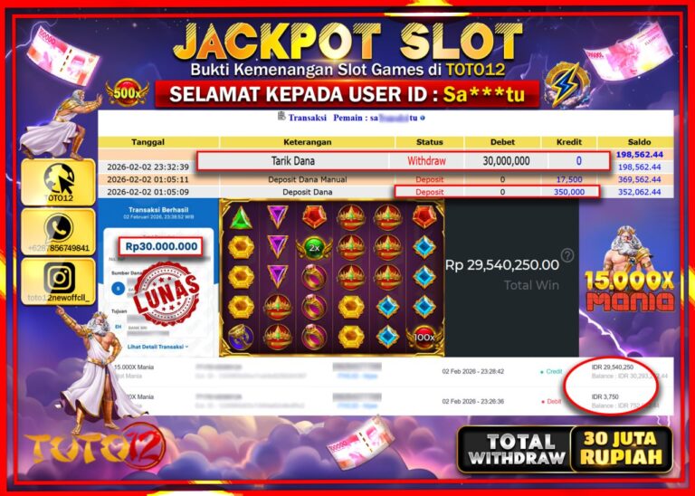 Selamat kepada Member Kami Sa****** Telah Jackpot dan berhasil mendapatkan kemenangan besar pada permainan JACKPOT SLOT GAME (15.000X MANIA) Dengan Kemenangan Sebesar Rp.30.000.000 –. Setelah mengisi Fomulir Withdraw dengan Kurang waktu 1-2 Menit Dana sudah kami Trasnfer kepada Pemilik Userid dan dana sudah dapat di cairkan oleh pemenang. Bukti Pembayaran yang TOTO12 berikan merupakan Bukti Pembayaran…