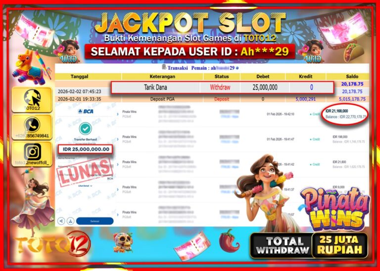 Selamat kepada Member Kami Ah****** Telah Jackpot dan berhasil mendapatkan kemenangan besar pada permainan JACKPOT SLOT GAME (PINATA WINS) Dengan Kemenangan Sebesar Rp.25.000.000 –. Setelah mengisi Fomulir Withdraw dengan Kurang waktu 1-2 Menit Dana sudah kami Trasnfer kepada Pemilik Userid dan dana sudah dapat di cairkan oleh pemenang. Bukti Pembayaran yang TOTO12 berikan merupakan Bukti Pembayaran…
