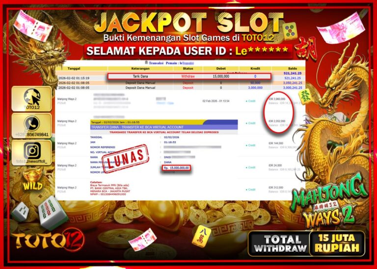 Selamat kepada Member Kami Le****** Telah Jackpot dan berhasil mendapatkan kemenangan besar pada permainan JACKPOT SLOT GAME (MAHJONG WAYS 2) Dengan Kemenangan Sebesar Rp.15.000.000 –. Setelah mengisi Fomulir Withdraw dengan Kurang waktu 1-2 Menit Dana sudah kami Trasnfer kepada Pemilik Userid dan dana sudah dapat di cairkan oleh pemenang. Bukti Pembayaran yang TOTO12 berikan merupakan Bukti…