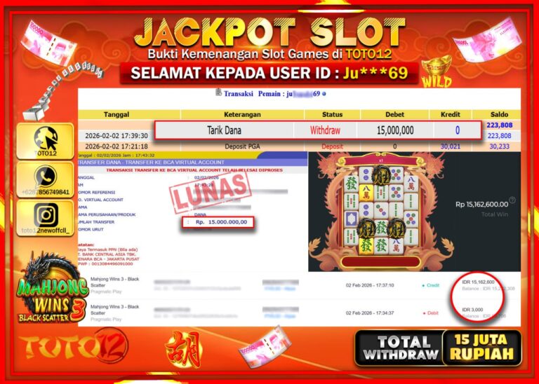 Selamat kepada Member Kami Ju****** Telah Jackpot dan berhasil mendapatkan kemenangan besar pada permainan JACKPOT SLOT GAME (MAHJONG WAYS 3 BLACK SCATTER Dengan Kemenangan Sebesar Rp.15.000.000 –. Setelah mengisi Fomulir Withdraw dengan Kurang waktu 1-2 Menit Dana sudah kami Trasnfer kepada Pemilik Userid dan dana sudah dapat di cairkan oleh pemenang. Bukti Pembayaran yang TOTO12 berikan…