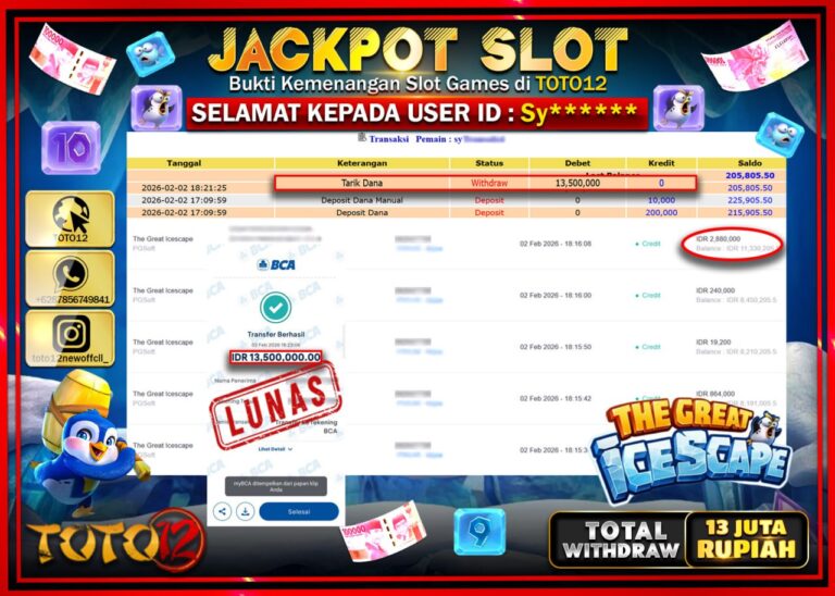 Selamat kepada Member Kami Sy****** Telah Jackpot dan berhasil mendapatkan kemenangan besar pada permainan JACKPOT SLOT GAME (THE GREAT ICESCAPE) Dengan Kemenangan Sebesar Rp.13.500.000 –. Setelah mengisi Fomulir Withdraw dengan Kurang waktu 1-2 Menit Dana sudah kami Trasnfer kepada Pemilik Userid dan dana sudah dapat di cairkan oleh pemenang. Bukti Pembayaran yang TOTO12 berikan merupakan Bukti…