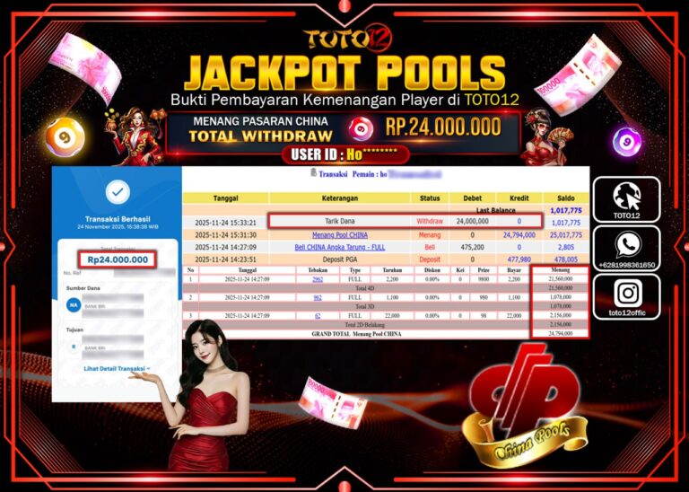 Selamat kepada Member Kami Ho****** Telah Jackpot dan berhasil mendapatkan kemenangan besar pada permainan JACKPOT POOLS PASARAN (CHINA) Dengan Kemenangan Sebesar Rp.24.000.000 –. Setelah mengisi Fomulir Withdraw dengan Kurang waktu 1-2 Menit Dana sudah kami Trasnfer kepada Pemilik Userid dan dana sudah dapat di cairkan oleh pemenang. Bukti Pembayaran yang TOTO12 berikan merupakan Bukti Pembayaran yang …