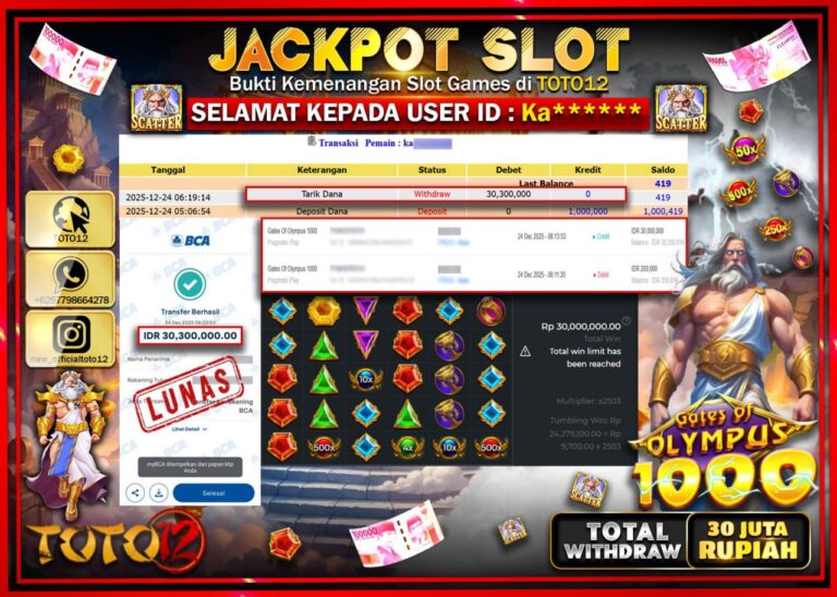 Selamat kepada Member Kami Ke****** Telah Jackpot dan berhasil mendapatkan kemenangan besar pada permainan JACKPOT PRAGMATIC PLAY LIVE CASINO (MEGA WHEEL) Dengan Kemenangan Sebesar Rp.120.000.000 –. Setelah mengisi Fomulir Withdraw dengan Kurang waktu 1-2 Menit Dana sudah kami Trasnfer kepada Pemilik Userid dan dana sudah dapat di cairkan oleh pemenang. Bukti Pembayaran yang TOTO12 berikan merupakan…