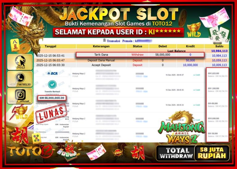Selamat kepada Member Kami Kl****** Telah Jackpot dan berhasil mendapatkan kemenangan besar pada permainan JACKPOT SLOT GAME (MAHJONG WAYS 2) Dengan Kemenangan Sebesar Rp.58.000.000 –. Setelah mengisi Fomulir Withdraw dengan Kurang waktu 1-2 Menit Dana sudah kami Trasnfer kepada Pemilik Userid dan dana sudah dapat di cairkan oleh pemenang. Bukti Pembayaran yang TOTO12 berikan merupakan Bukti…