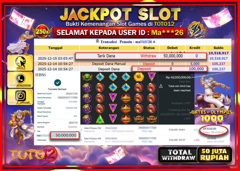 Selamat kepada Member Kami Go****** Telah Jackpot dan berhasil mendapatkan kemenangan besar pada permainan JACKPOT SLOT GAME (GATES OF OLYMPUS SUPER SCATTER) Dengan Kemenangan Sebesar Rp.50.000.000 –. Setelah mengisi Fomulir Withdraw dengan Kurang waktu 1-2 Menit Dana sudah kami Trasnfer kepada Pemilik Userid dan dana sudah dapat di cairkan oleh pemenang. Bukti Pembayaran yang TOTO12 berikan…