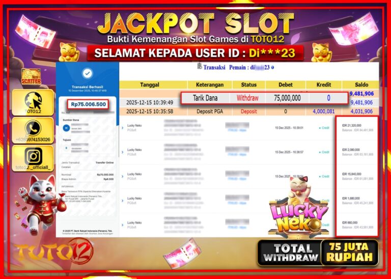Selamat kepada Member Kami Di****** Telah Jackpot dan berhasil mendapatkan kemenangan besar pada permainan JACKPOT SLOT GAME (LUCKY NEKO) Dengan Kemenangan Sebesar Rp.75.000.000 –. Setelah mengisi Fomulir Withdraw dengan Kurang waktu 1-2 Menit Dana sudah kami Trasnfer kepada Pemilik Userid dan dana sudah dapat di cairkan oleh pemenang. Bukti Pembayaran yang TOTO12 berikan merupakan Bukti Pembayaran…