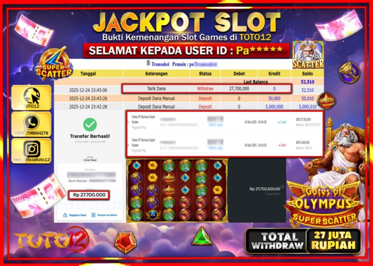 Selamat kepada Member Kami Pa****** Telah Jackpot dan berhasil mendapatkan kemenangan besar pada permainan JACKPOT SLOT GAME (GATES OF OLYMPUS SUPER SCATTER) Dengan Kemenangan Sebesar Rp.27.700.000 –. Setelah mengisi Fomulir Withdraw dengan Kurang waktu 1-2 Menit Dana sudah kami Trasnfer kepada Pemilik Userid dan dana sudah dapat di cairkan oleh pemenang. Bukti Pembayaran yang TOTO12 berikan…