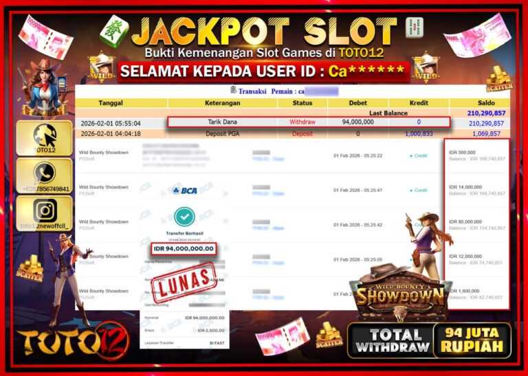 Selamat kepada Member Kami Ca****** Telah Jackpot dan berhasil mendapatkan kemenangan besar pada permainan JACKPOT SLOT GAME (WILD BOUNTY SHOWDOWN) Dengan Kemenangan Sebesar Rp.94.000.000–. Setelah mengisi Fomulir Withdraw dengan Kurang waktu 1-2 Menit Dana sudah kami Trasnfer kepada Pemilik Userid dan dana sudah dapat di cairkan oleh pemenang. Bukti Pembayaran yang TOTO12 berikan merupakan Bukti Pembayaran…