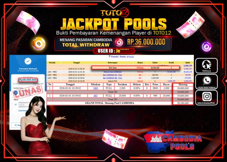 HANYA DI TOTO12 JP PASTI DI BAYAR LUNAS DAN CEPAT!!!!!! JACKPOT POOLS PASARAN (CAMBODIA) Rp.36.000.000 !!!!