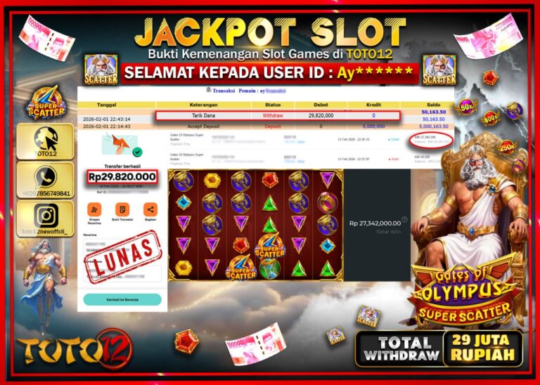 Selamat kepada Member Kami Ay****** Telah Jackpot dan berhasil mendapatkan kemenangan besar pada permainan JACKPOT SLOT GAME (GATES OF OLYMPUS SUPER SCATTER) Dengan Kemenangan Sebesar Rp.29.820.000 –. Setelah mengisi Fomulir Withdraw dengan Kurang waktu 1-2 Menit Dana sudah kami Trasnfer kepada Pemilik Userid dan dana sudah dapat di cairkan oleh pemenang. Bukti Pembayaran yang TOTO12 berikan…
