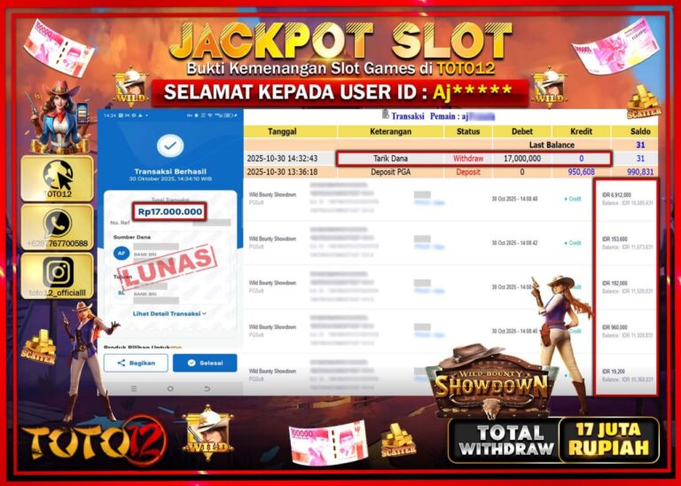Selamat kepada Member Kami Aj****** Telah Jackpot dan berhasil mendapatkan kemenangan besar pada permainan JACKPOT SLOT GAME (WILD BOUNTY SHOWDOWN) Dengan Kemenangan Sebesar Rp.17.000.000 –. Setelah mengisi Fomulir Withdraw dengan Kurang waktu 1-2 Menit Dana sudah kami Trasnfer kepada Pemilik Userid dan dana sudah dapat di cairkan oleh pemenang. Bukti Pembayaran yang TOTO12 berikan merupakan Bukti…