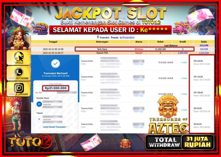 Selamat kepada Member Kami Ke****** Telah Jackpot dan berhasil mendapatkan kemenangan besar pada permainan JACKPOT SLOT GAME (TREASURES OF AZTEC) Dengan Kemenangan Sebesar Rp.31.000.000 –. Setelah mengisi Fomulir Withdraw dengan Kurang waktu 1-2 Menit Dana sudah kami Trasnfer kepada Pemilik Userid dan dana sudah dapat di cairkan oleh pemenang. Bukti Pembayaran yang TOTO12 berikan merupakan Bukti…