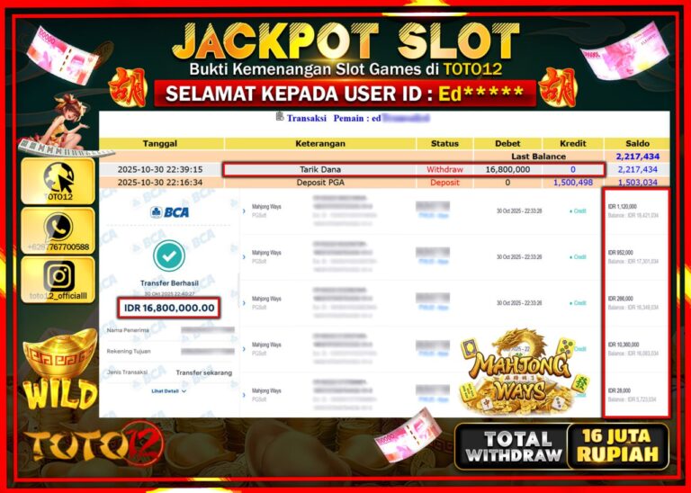 Selamat kepada Member Kami Ed****** Telah Jackpot dan berhasil mendapatkan kemenangan besar pada permainan JACKPOT SLOT GAME (MAHJONG WAYS) Dengan Kemenangan Sebesar Rp.16.800.000 –. Setelah mengisi Fomulir Withdraw dengan Kurang waktu 1-2 Menit Dana sudah kami Trasnfer kepada Pemilik Userid dan dana sudah dapat di cairkan oleh pemenang. Bukti Pembayaran yang TOTO12 berikan merupakan Bukti Pembayaran…