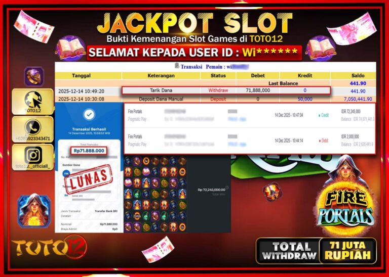 Selamat kepada Member Kami Wi****** Telah Jackpot dan berhasil mendapatkan kemenangan besar pada permainan JACKPOT SLOT GAME (FIRE PORTALS) Dengan Kemenangan Sebesar Rp.71.888.000 –. Setelah mengisi Fomulir Withdraw dengan Kurang waktu 1-2 Menit Dana sudah kami Trasnfer kepada Pemilik Userid dan dana sudah dapat di cairkan oleh pemenang. Bukti Pembayaran yang TOTO12 berikan merupakan Bukti Pembayaran…