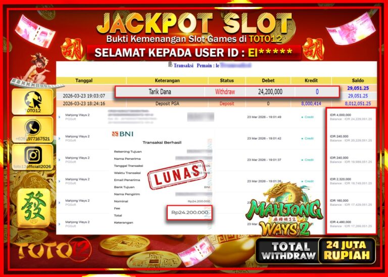 Selamat kepada Member Kami EI***** Telah Jackpot dan berhasil mendapatkan kemenangan besar pada permainan JACKPOT POOLS PASARAN (MAHJONG WAYS 2) Dengan Kemenangan Sebesar Rp.24.200.000–. Setelah mengisi Fomulir Withdraw dengan Kurang waktu 1-2 Menit Dana sudah kami Trasnfer kepada Pemilik Userid dan dana sudah dapat di cairkan oleh pemenang. Bukti Pembayaran yang TOTO12 berikan merupakan Bukti Pembayaran…