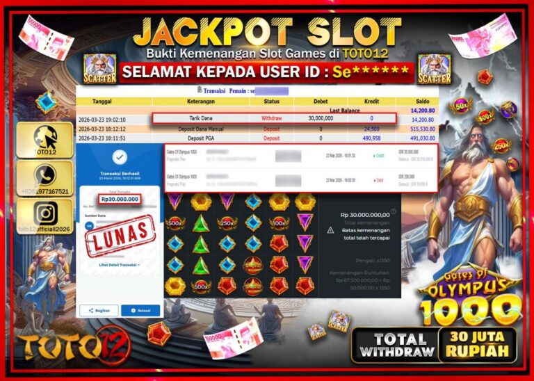 Selamat kepada Member Kami Se**** Telah Jackpot dan berhasil mendapatkan kemenangan besar pada permainan JACKPOT SLOT GAME (GATES OF OLYMPUS 1000) Dengan Kemenangan Sebesar Rp.30.00.000–. Setelah mengisi Fomulir Withdraw dengan Kurang waktu 1-2 Menit Dana sudah kami Trasnfer kepada Pemilik Userid dan dana sudah dapat di cairkan oleh pemenang. Bukti Pembayaran yang TOTO12 berikan merupakan Bukti…