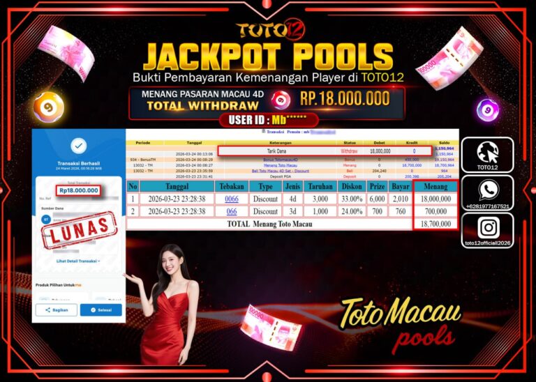 Selamat kepada Member Kami Mb***** Telah Jackpot dan berhasil mendapatkan kemenangan besar pada permainan JACKPOT POOLS PASARAN (MACAU 4D) Dengan Kemenangan Sebesar Rp.18.000.000–. Setelah mengisi Fomulir Withdraw dengan Kurang waktu 1-2 Menit Dana sudah kami Trasnfer kepada Pemilik Userid dan dana sudah dapat di cairkan oleh pemenang. Bukti Pembayaran yang TOTO12 berikan merupakan Bukti Pembayaran yang SAH…